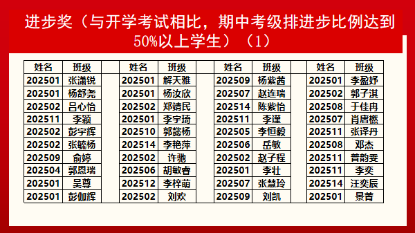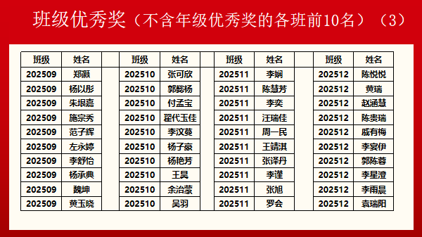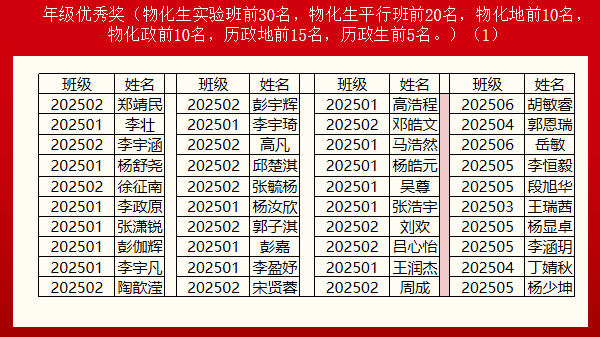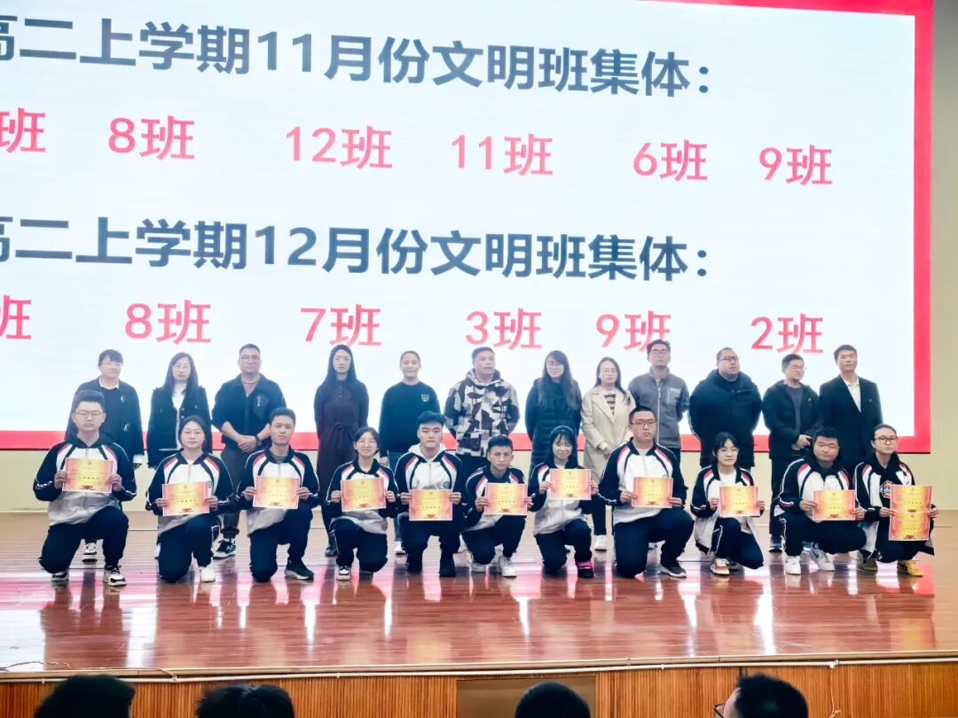 本次年级大会依据高二上学期文明班集体评比结果和期末考核成绩,对优秀班集体和各类优秀学生进行了表彰。考试成绩是对勤劳者的表彰,更是对踌躇者的鞭策。(图片为部分表彰名单)